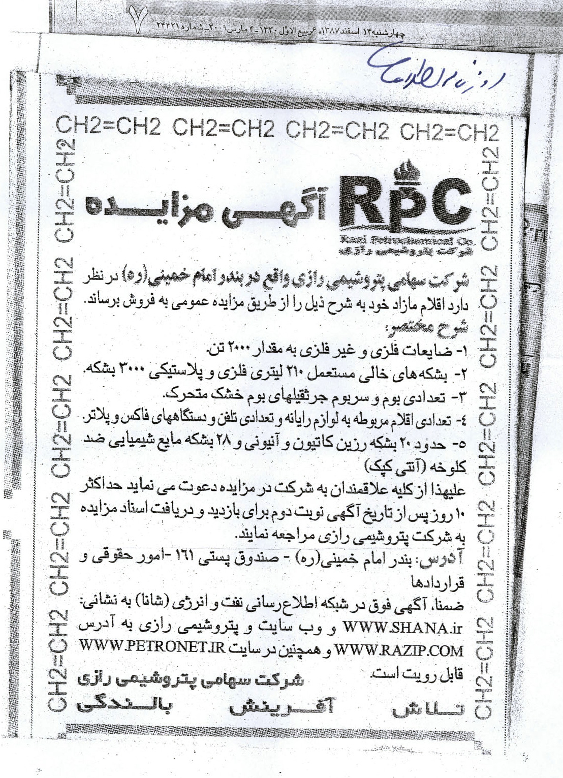 شرکت سهامی پتروشیمی رازی واقع در بندرامام خمینی (ره) در نظر دارد اقلام مازاد خود بشرح ذیل را از طریق مزایده عمومی به فروش برساند.